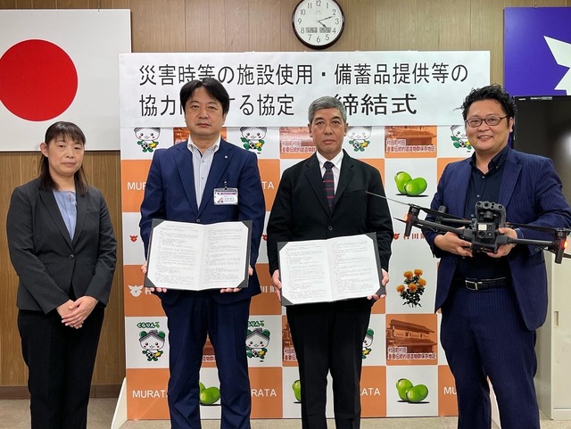 2022.8.26(金)、村田町と大沼舗設で、災害時における協定を締結しました。 内容は、①有資格者を伴ったドローン貸与 ②駐車場その他設備貸与 ③町民人口1%分の災害備蓄品提供です。 当社はこれまで“土木・舗装”を業種として「陸」を舞台としてきましたが、これからは“災害復興及び対策”こそ主業種として、「陸と空」を舞台に飛躍して参ります。