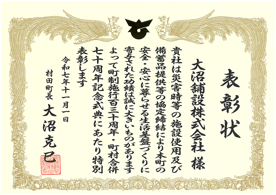 村田町が町制になって130年。その記念すべき日に、当社の災害時の施設使用や備蓄品提供の功績を、表彰頂きました。村田町の歴史に名を刻ませて頂いたことは大変光栄なことです。会社にとって売上や利益が大事なのは、得た利益を地域に還元するため。そのために、これからも一つ一つの工事を大事に、安全に、取り組んで参ります。ありがとうございました。