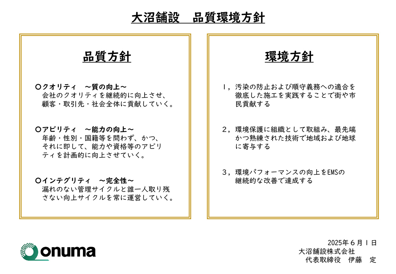 弊社にて2025.12.9付でISO9001/Ams1:2024を取得しました。会社の質の向上を目的として、弊社の品質方針を下記の通り定めます。
